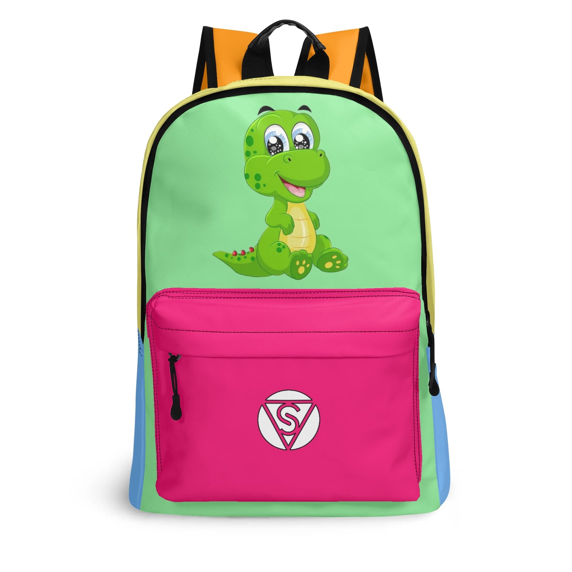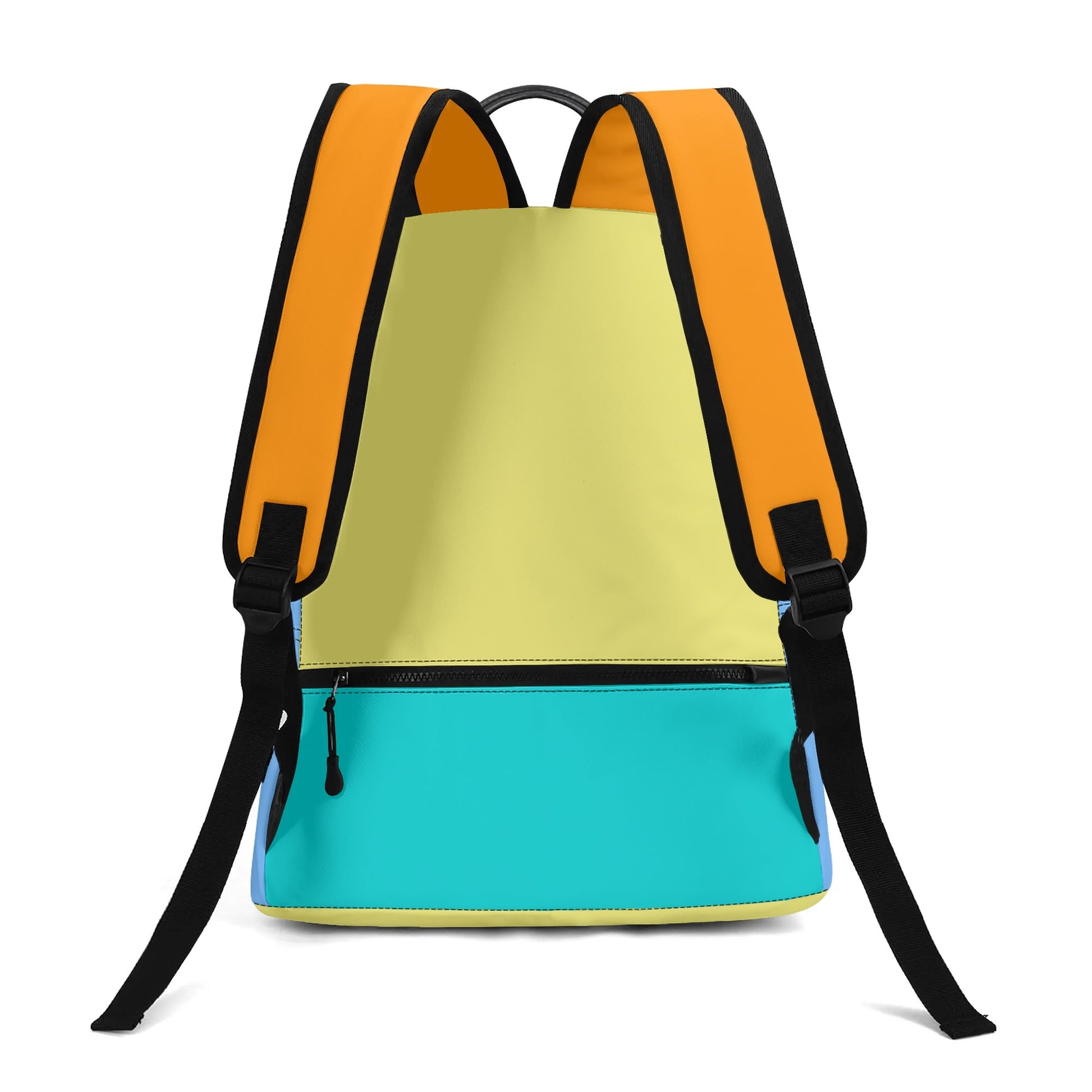 It features a spacious interior compartment with a secure zipper closure, a zippered front pocket, and two side pockets for bottles or other items. Adjustable straps and a carrying handle allow for comfortable carrying.