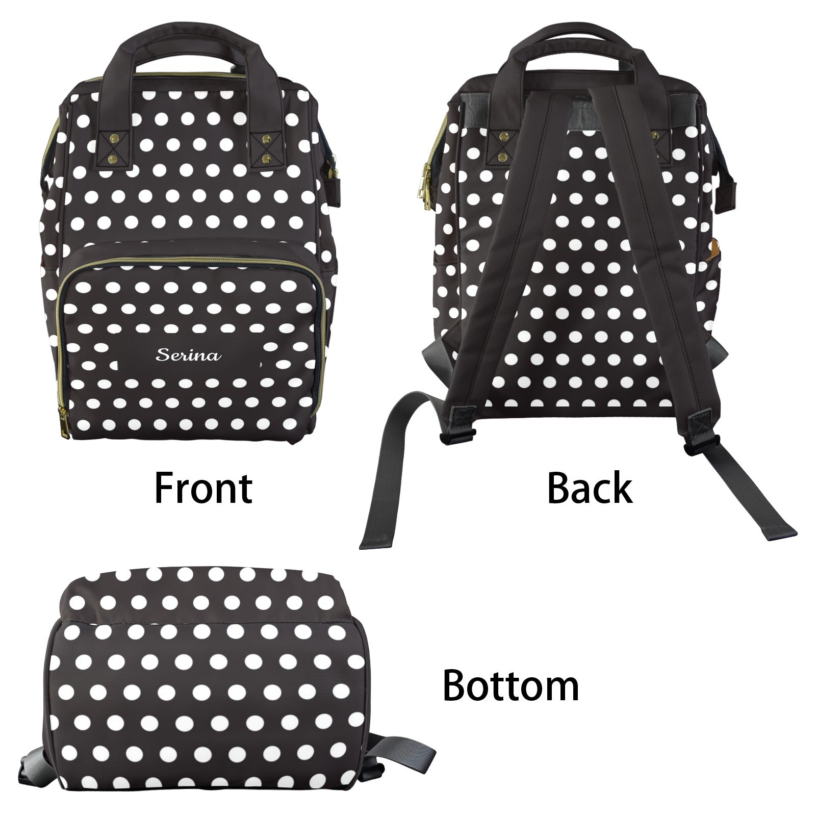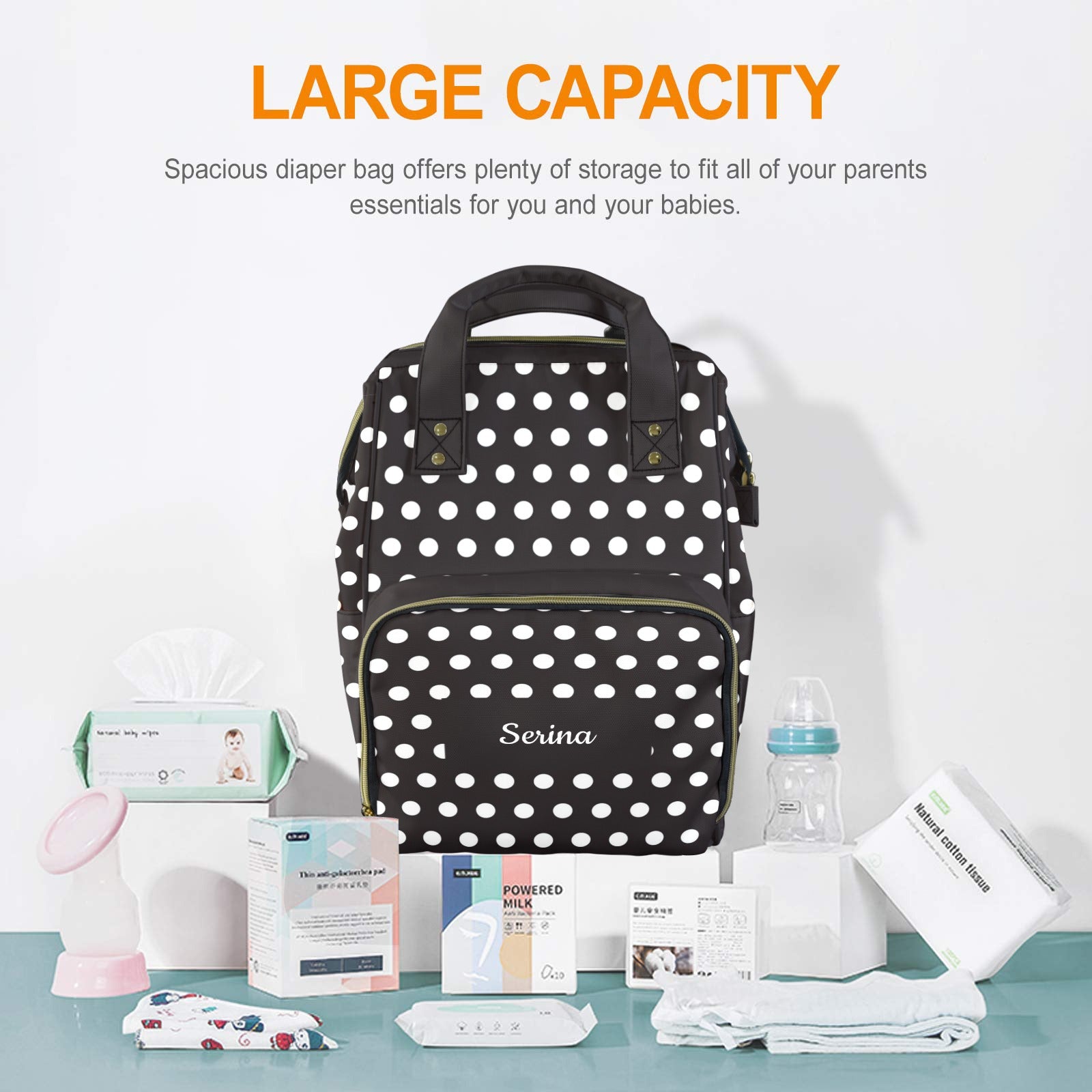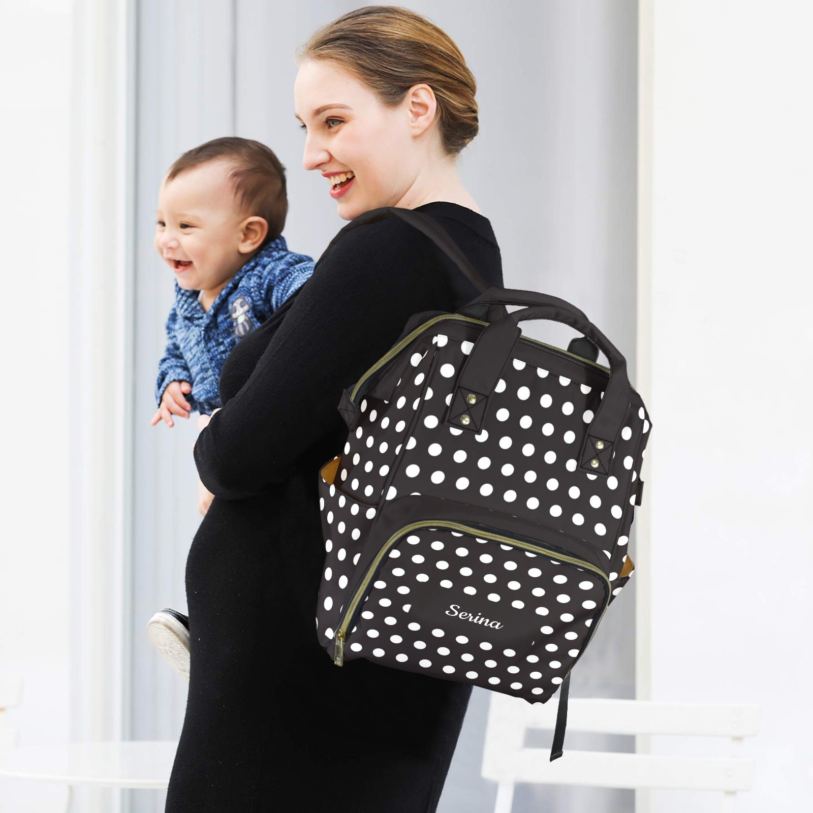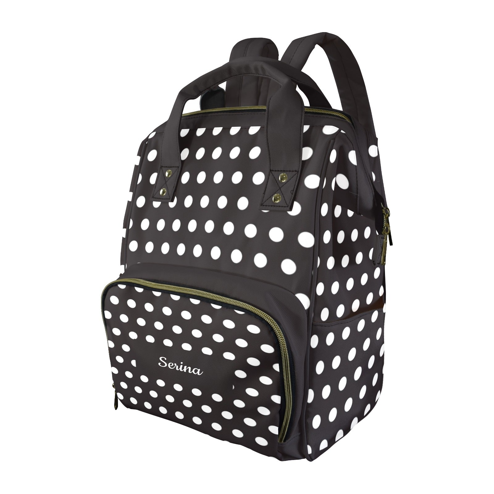 Esta mochila pañalera multifunción con estampado polka dots combina estilo y practicidad en un accesorio único. Su diseño espacioso y organizado ofrece todo lo que los padres necesitan para llevar pañales, biberones y accesorios de forma cómoda y ordenada.
